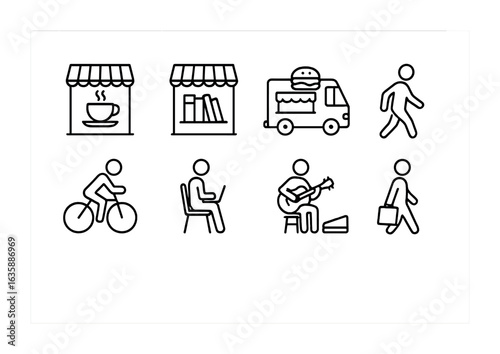 City Lifestyle Icons. Outline icon set of city lifestyle: coffee shop, bookstore, food truck, pedestrian,