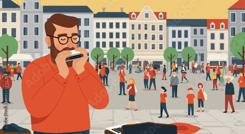 Musician playing a harmonica in a bustling city plaza; buildings and people around