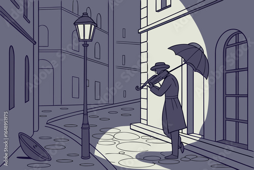 A street musician plays violin under a lamplight in a quiet Paris alley on a rainy night.