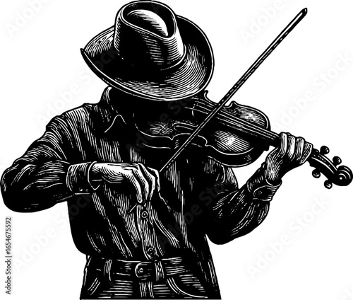 Vintage engraved illustration of street musician playing violin silhouette for retro design