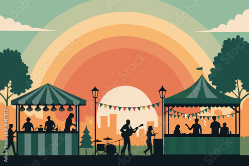Bustling street festival with live music and food vendors.
