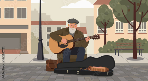 Street musician playing guitar urban park illustration city environment close-up view creative concept. Vector illustration