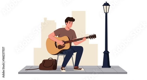 Street guitar performance by musician in urban setting digital illustration vibrant environment engaging scene. Vector illustration