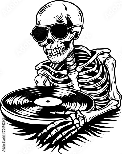 SVG of a skeleton musician showcasing a street lifestyle with Halloween vibes. Cool Skeleton with Vinyl Record and Sunglasses in Vintage Style