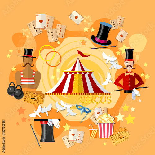 Traveling Chapiteau Circus with Strongman, Acrobat, Magician, Elephant and Tent Vector Set