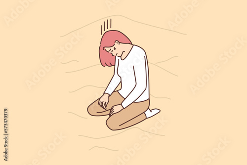 Tired exhausted sweated man in gym after workout. Unhappy fatigue sweaty person after training. Exhaustion and tiredness from physical exercises. Flat vector illustration isolated on white background
