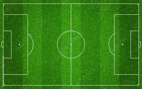 Vector illustration of a green soccer football field with a ball and player silhouettes for a competitive sports match or table foosball game