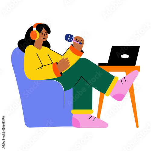 Illustration of a woman podcasting or streaming live, using a computer and microphone