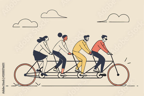 Family with children riding long tandem bicycle together. Father, mother and kids cycling multi-pedal bike for multiple riders. Flat vector illustration of co-cyclists isolated on white background