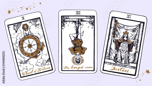 Bold vector tarot card set featuring The Wheel of Fortune,  Justice, The Lovers in vintage mid-century modern style with mystical symbolism and vibrant retro colors