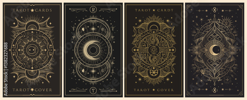 Tarot card back design. Mystic esoteric celestial backgrounds set with sacred sun, moon, crescent, star symbols, linear cosmic patterns in spiritual magic line art style. Flat vector illustration