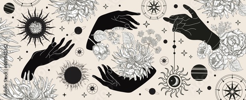 Set of boho hand drawn mystical magic set. Esoteric doodle elements and logo icons with hands, raven dagger. Black outline style. Abstract vector illustration