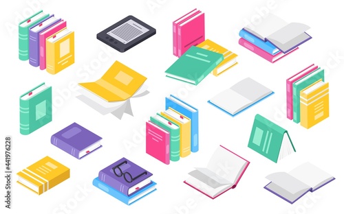 Isometric 3d book. Stacks or piles of books, open textbooks with bookmark, ebook. University library education literature icon vector set. Objects for learning or studying information
