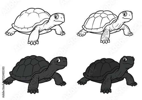 Linear tortoise line art: four illustrative turtle designs for coloring
