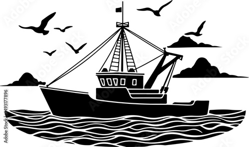 A detailed black and white illustration of a fishing trawler boat at sea with seagulls flying above, isolated on