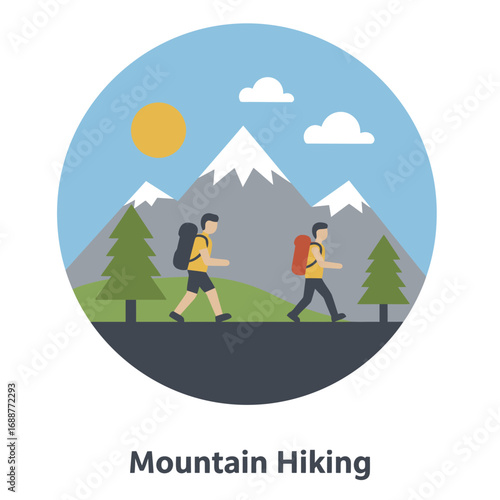 Silhouettes of people hiking in mountains, Hiking Circular Logo, Hiking icon, Silhouette of a man with a backpack in the mountains