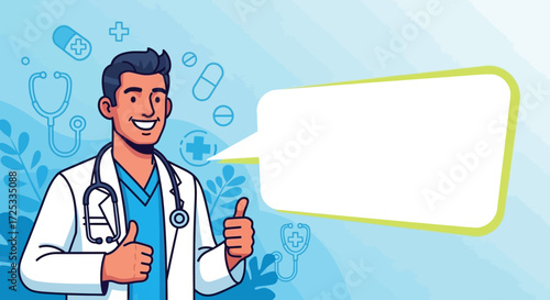 A friendly animated doctor offers positive health advice and medical information, smiling with a thumbs-up next to a blank speech bubble.