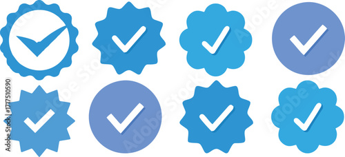Set of blue verified check mark badge icons for approval, certification, trust, guarantee, validation, quality assurance, confirmation, and official verification symbol
