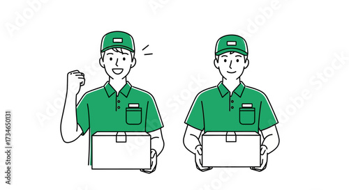 Friendly and efficient delivery professionals in green uniforms, confidently showcasing reliable parcel service. Conceptual graphic for express shipping and customer satisfaction