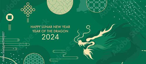 Chinese Lunar New Year 2024 Elegant Dragon Design with Festive Green and Gold Patterns. Modern Chinese Zodiac Art for Celebrations and Greetings.