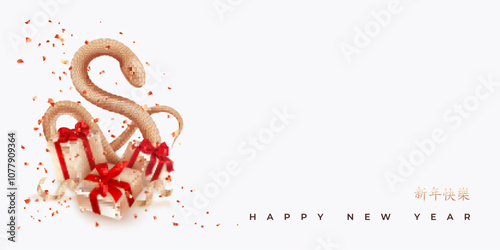 Happy chinese new year 2025 the snake zodiac sign with minimal trendy design elements red paper cut style on color background. ( Translation : happy new year 2025 year of the snake )
