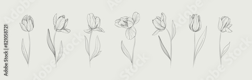 Vector line art set of tulips, spring flowers. Tulip flower. Tulip illustration.