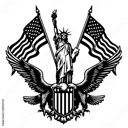 Black and white illustration of the United States flag with stars and stripes waving