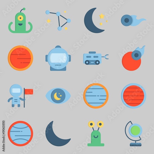 Icons set about Universe with alien, astronaut, flag, orbit, comet and meteorite