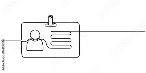A minimalist line art illustration of a generic identification badge or name tag with placeholders for a photo, name, and title, suitable for corporate or event use.