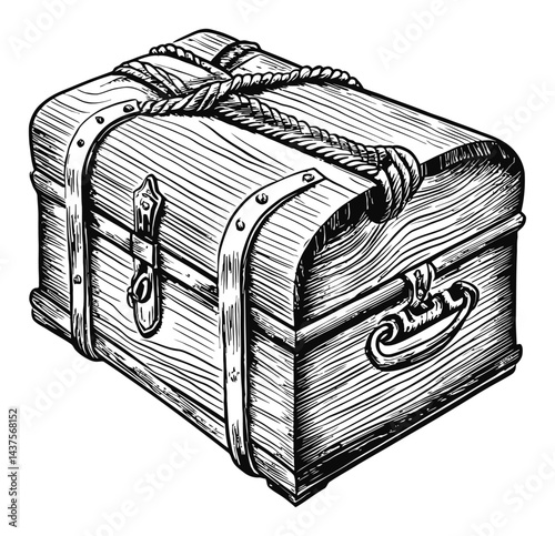 Detailed black-and-white line art illustration of a wooden treasure chest with a keyhole.