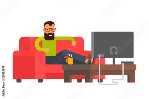 Man lies watching TV, weekend, watching TV shows, laziness. Flat design vector illustration.