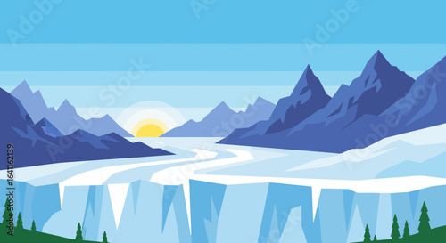 Minimalist glacier landscape with mountains and sun illustration scene