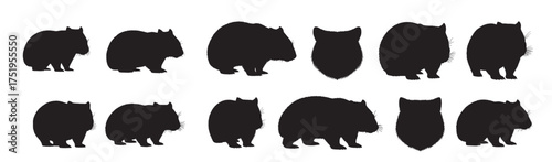 Set of wombat silhouettes in various poses. isolated vector on white background.