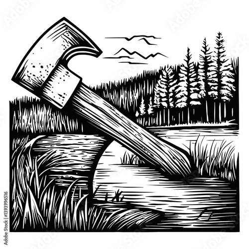 A stark black and white depiction of a handheld woodcutting axe in silhouette