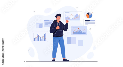 10000 подписчиков, счастливый блогер, празднующий достижение целей блога, плоская векторная иллюстрация. 10 тысяч подписчиков в социальных сетях. Ведение блога.