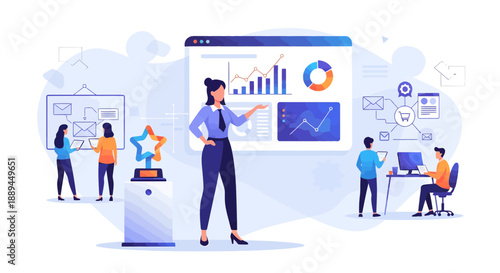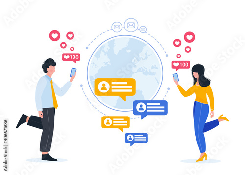 1000000 подписчиков, счастливые блоггеры, празднующие успешные достижения целей блога с кубком трофея, плоская векторная иллюстрация. 1 млн подписчиков в социальных сетях. Ведение блога.