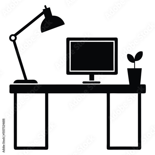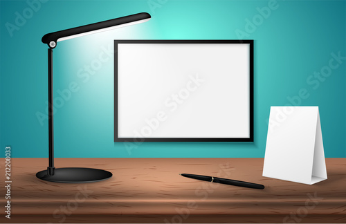 3d настольная лампа на деревянном столе освещает пустые плакаты на стене. Векторная иллюстрация. Скопируйте пространство для текстового шаблона