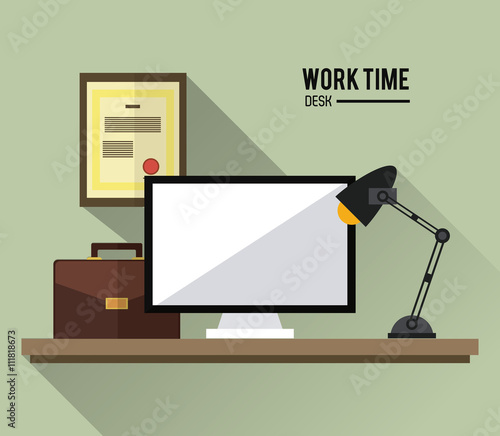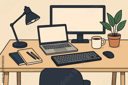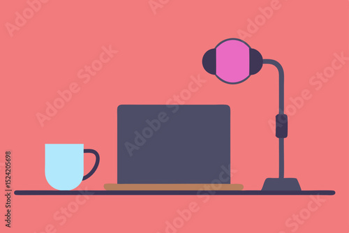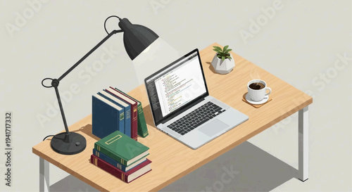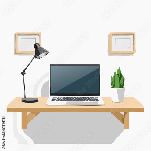 3d настольная лампа на деревянном столе освещает пустые плакаты на стене. Векторная иллюстрация. Скопируйте пространство для текстового шаблона