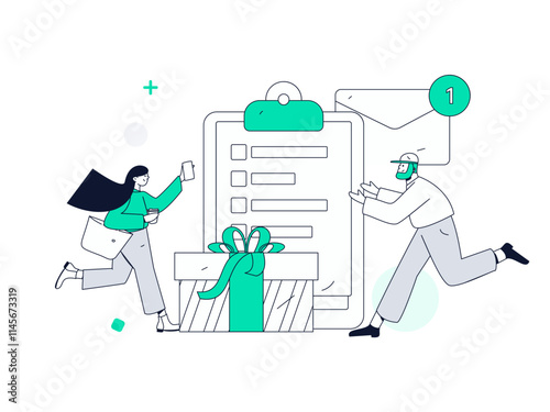 Огромный ноутбук с предупреждением об ошибке 404 на экране, микросимволы, векторная иллюстрация дизайна в плоском стиле. Рабочий спешит помочь испуганной девушке исправить ошибку 404 Страница не найдена, Сайт в стадии разработки.