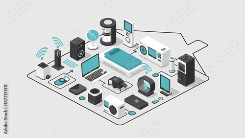 мобильный телефон 5g с приложением IoT, плоская векторная изометрическая иллюстрация. Интернет вещей, технологии "умного дома". сотовая сеть 5g, соединяющая машины, объекты и устройства.