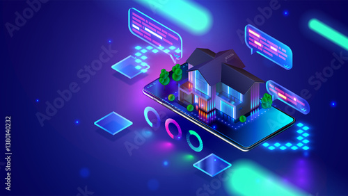 Баннер веб-сайта сети 5G, шаблон дизайна веб-страницы, изометрическая светящаяся неоновая векторная иллюстрация. Высокая скорость передачи данных. Умный город. Мобильная сеть 5-го поколения.