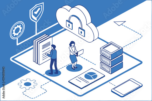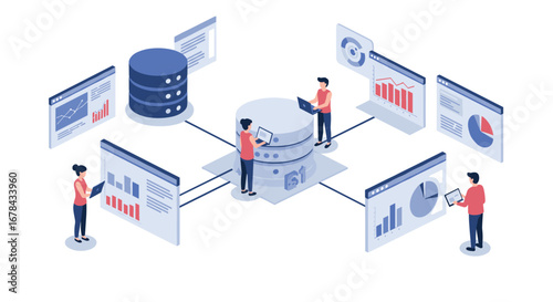 Блок-схема беспроводной технологии сети 5G, плоская векторная изометрическая иллюстрация. потребитель 5g с сотовым телефоном, вышкой связи, сетевым сервером, измерителем скорости интернета, ноутбуком, смартфоном.