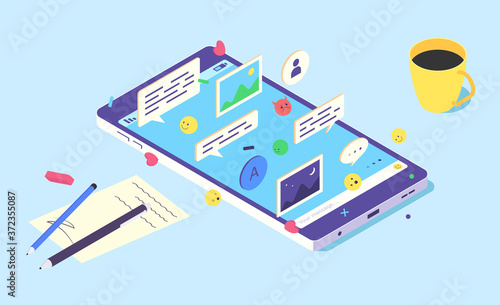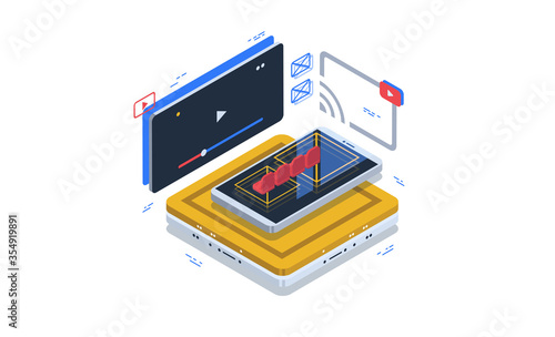 умный автомобиль 5g на экране смартфона, карта города с указанием местоположения, здание магазина, плоская векторная изометрическая иллюстрация. беспроводная сеть 5g и самоуправляемый автомобиль.