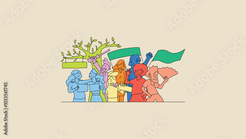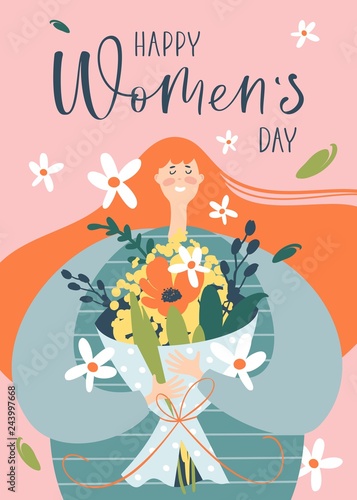 Плакат с Международным женским днем 8 марта, шаблон баннера, плоская векторная иллюстрация. Персонажи мужского пола поздравляют счастливых женщин и дарят им цветы и подарки.