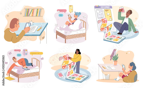 8 марта, набор для женского дня, плоская векторная изолированная иллюстрация. Счастливые женщины проводят выходной день в магазине одежды, модном бутике, спа-салоне, парикмахерской красоты и на домашних тренировках, практикуя йогу. Счастливого праздника