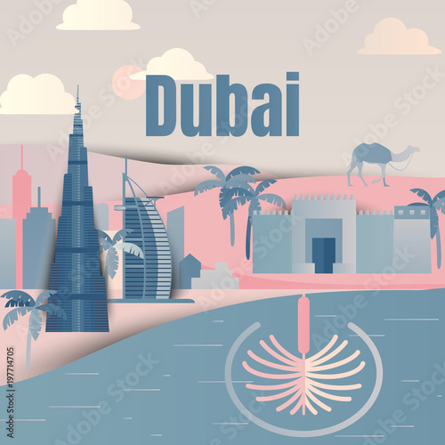 Город Абу-Даби, Объединенные Арабские Эмираты, векторная иллюстрация в стиле бумажного искусства. Большая мечеть, всемирно известные достопримечательности и туристические аттракционы Абу-Даби. Путешествия по всему миру.