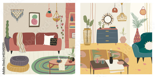 Интерьер гостиной взрослой женщины, векторная плоская иллюстрация. Уютная комната с мебелью, книгами и комнатными растениями на полках, лампой, книгами, фотографией и мобильным телефоном на ночном столике, швейной машинкой и т.д.