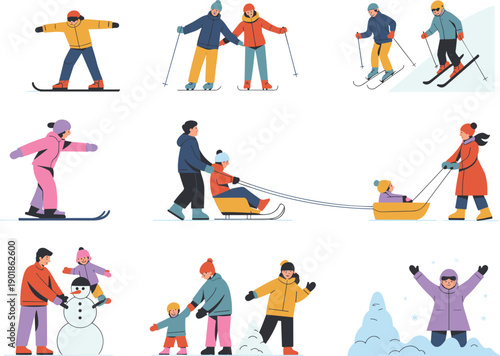 Взрослые и дети в веревочном парке, плоская векторная изолированная иллюстрация. Набор аттракционов парка приключений. Спорт, развлечения и веселье. Летние мероприятия на свежем воздухе.