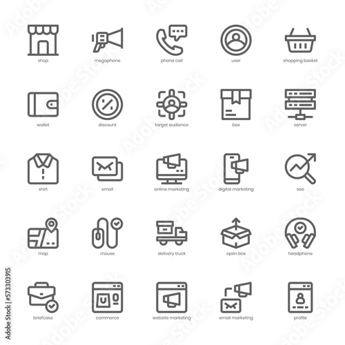 Значок рекламной линии бесшовный узор, выделенный на белом фоне. Продвижение продукта бесконечный фон с минимальными маркетинговыми знаками. Обои для веб-сайта с контурными векторными значками для бизнес-темы