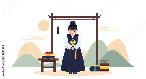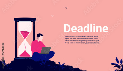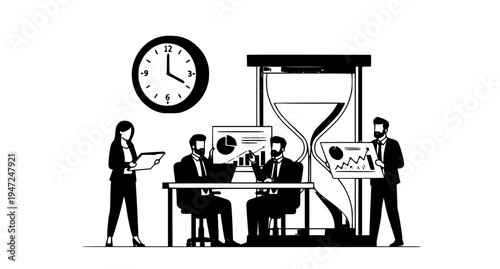 Молодая пара с новорожденным ребенком, огромные песочные часы, персонажи среднего возраста и пожилые мужчины, плоская векторная иллюстрация. Процесс старения, продолжительность жизни, поколение, жизненный цикл человека от младенчества до старших лет.